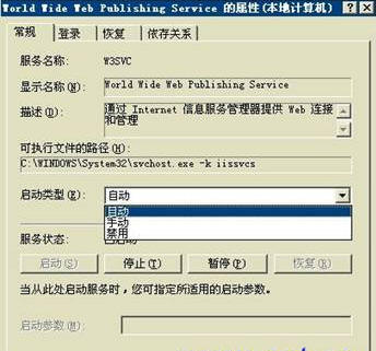 打开World Wide Web Publishing Service属性对话框,启动类型选择:自动,确定保存即可。如图27