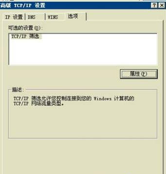 在“高级TCP/IP设置”里选中“选项”菜单的“TCP/IP筛选”,双击进入“TCP/IP筛选”对话框。如图31